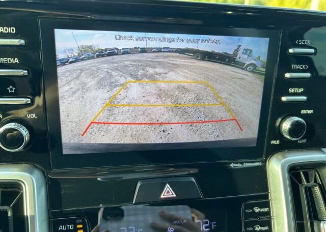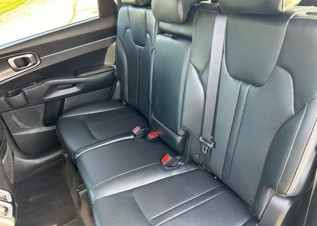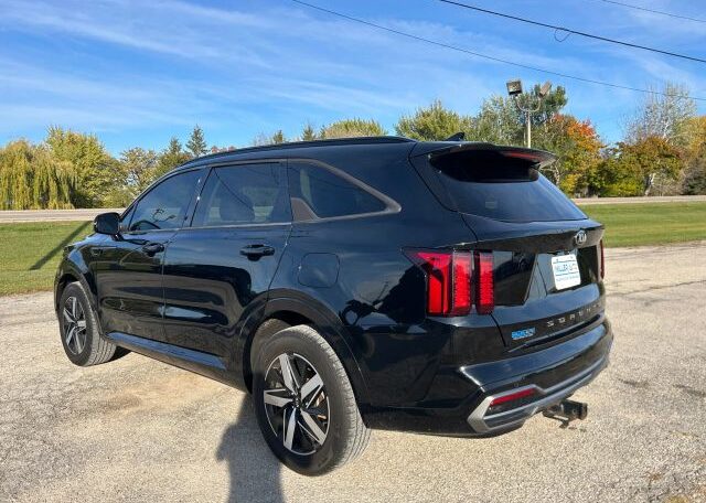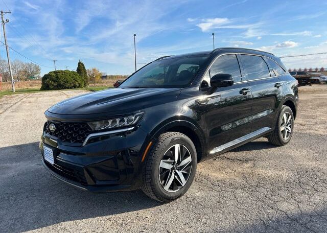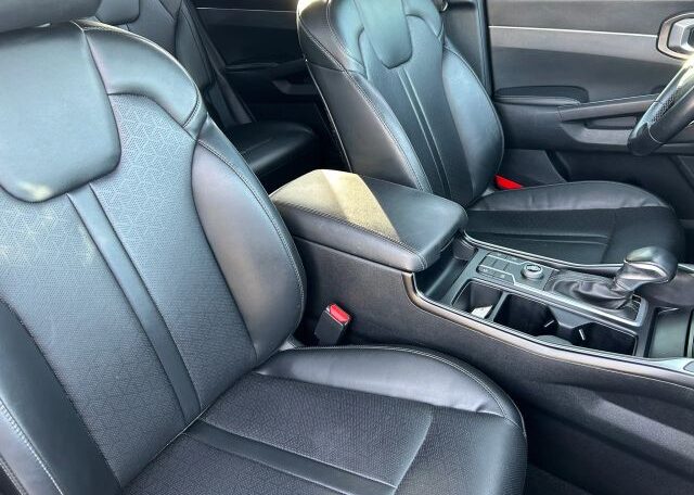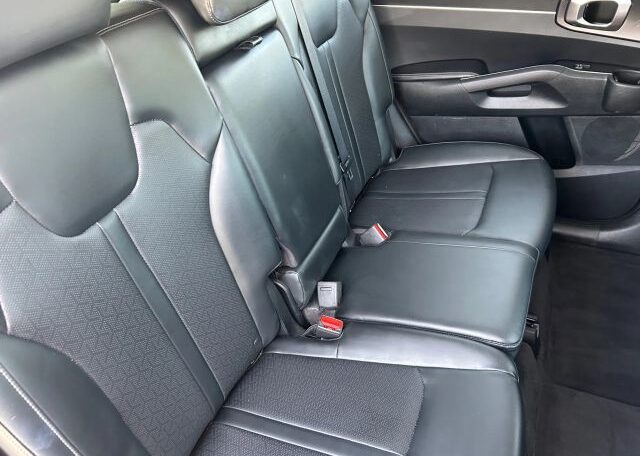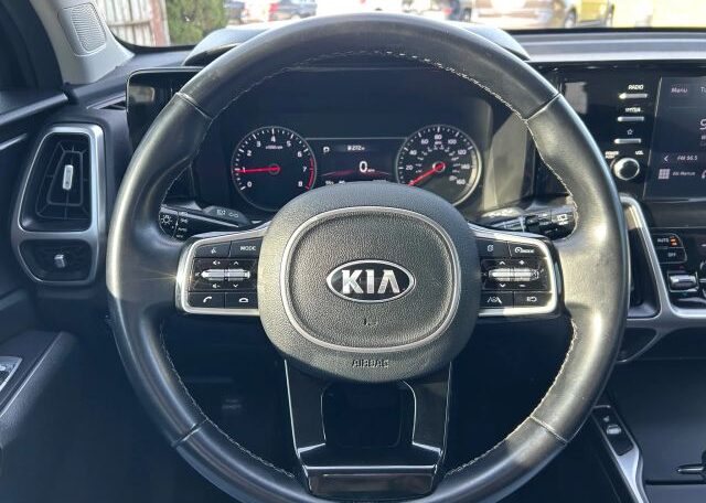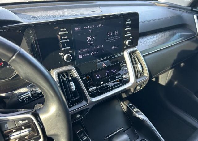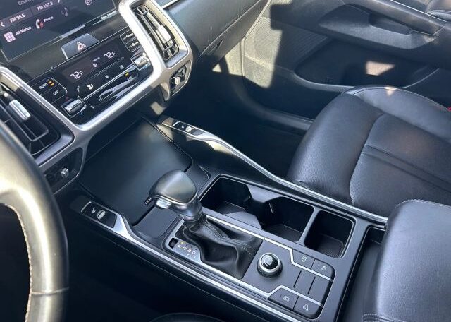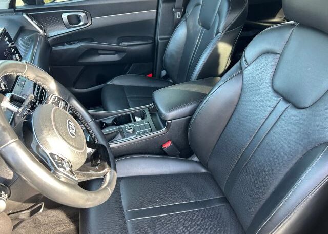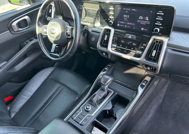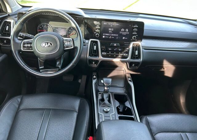 The 2021 Kia Sorento is a sleek and modern SUV with a stylish black exterior and interior. It features a spacious interior with 7 seats and a 2.5L engine size, making it perfect for long road trips or family outings. The Sorento comes equipped with features such as AM/FM stereo, air conditioning, heated and leather seats, cruise control, Bluetooth wireless, power seats, and Apple Carplay/Android Auto compatibility. Additionally, it boasts a range of safety features including driver and passenger airbags, anti-lock brakes, back seat safety belts, traction control, and side airbags. This vehicle offers both comfort and security for a seamless driving experience.